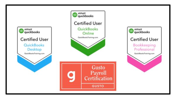 I am certified in QuickBooks Online and QuickBooks Desktop. I am also a Certified Bookkeeper through QuickBooks. I have a certificate for Gusto Payroll.